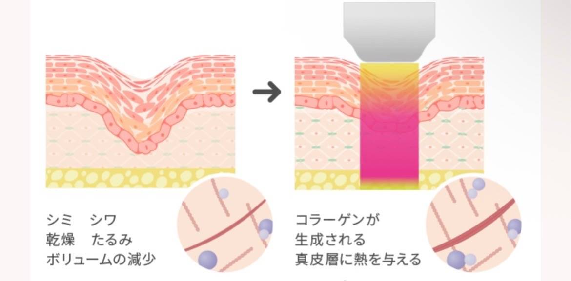 肌表面(表皮)にはダメージを与えず素通りし、真皮層にダイレクトに届きます。