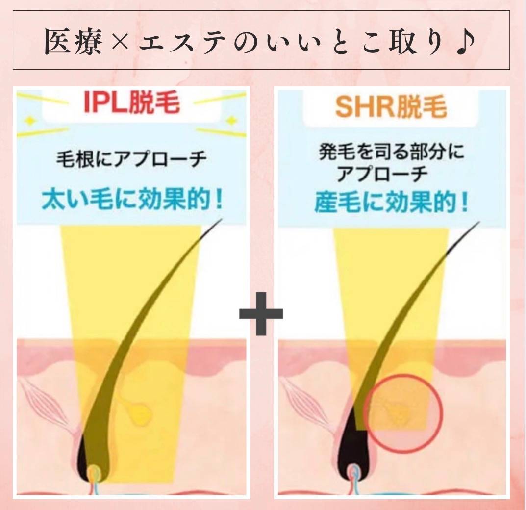 様々な脱毛機器がありますが、代表的なのはクリニックの『 IPL脱毛 』とエステの『 SHR脱毛 』。